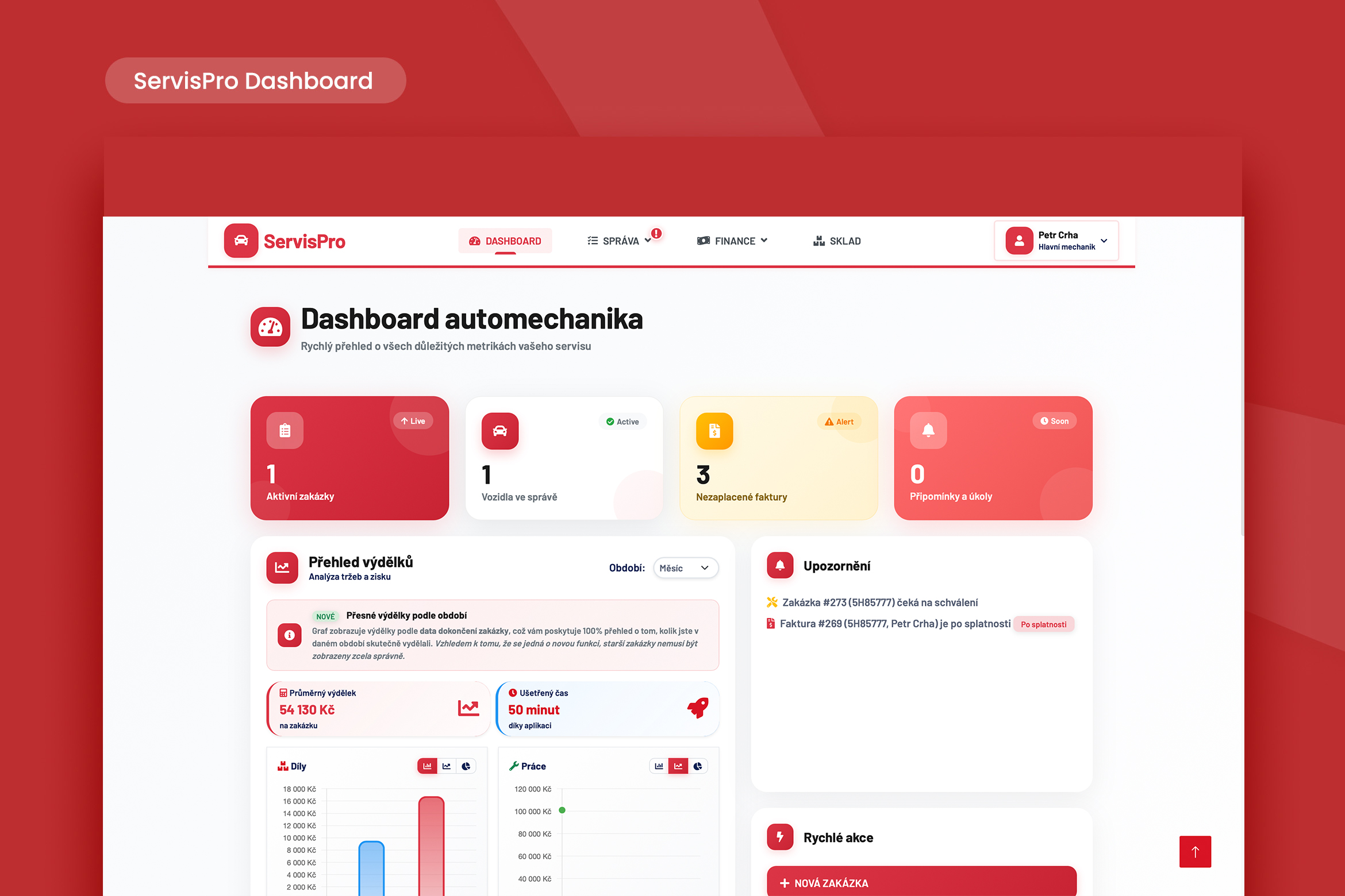 Okamžitě vidíte výkon servisu, náklady i ziskovost.